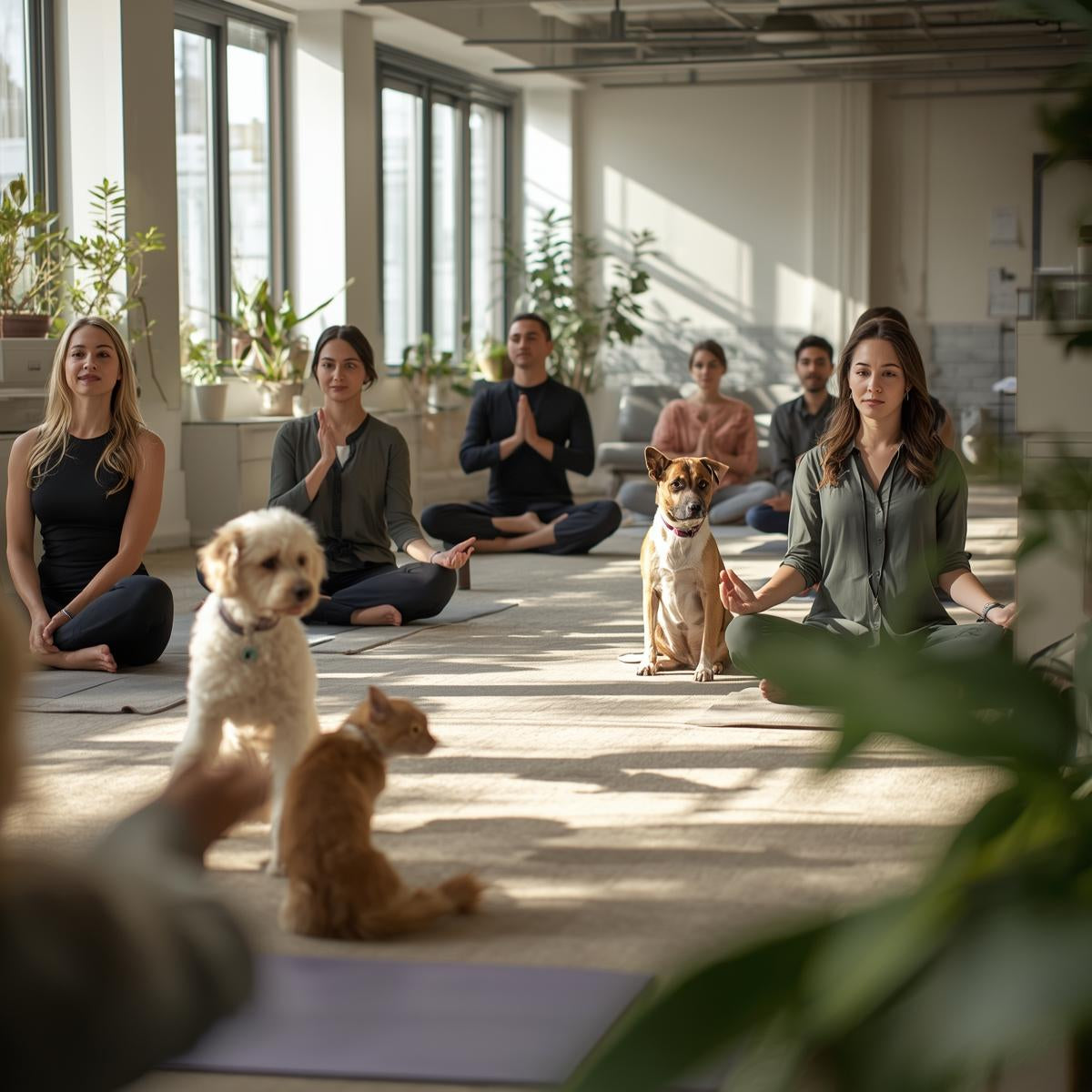 Enjoy gentle yoga with playful puppies to melt away workplace or daily stress.